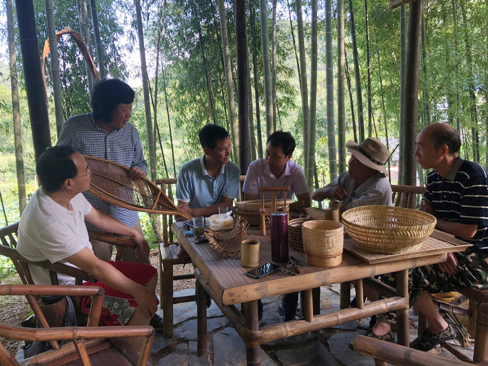 11-12日,林樂成一行還在石角村植物纖維工坊與溪口鎮(zhèn)的竹編工匠藝人進(jìn)行了現(xiàn)場(chǎng)竹制品制作工藝交流,探討怎樣實(shí)現(xiàn)工藝品的日用化和日用品的工藝化,交流活動(dòng)輕松愉快,一張照片圖案,經(jīng)過工匠藝人的手就能變成可觸摸的制品,感覺非常奇妙!10日一早,集團(tuán)公司、工藝品公司消薄工作組和林樂成一行冒著“利奇馬”帶來的大風(fēng)大雨,趕到省二輕集團(tuán)下屬工藝品公司幫扶結(jié)對(duì)的寺下村,深入調(diào)查研究,實(shí)地了解竹編廠生產(chǎn)經(jīng)營(yíng)和產(chǎn)品市場(chǎng)境況,與鎮(zhèn)、村委班子成員進(jìn)行了現(xiàn)場(chǎng)交流。